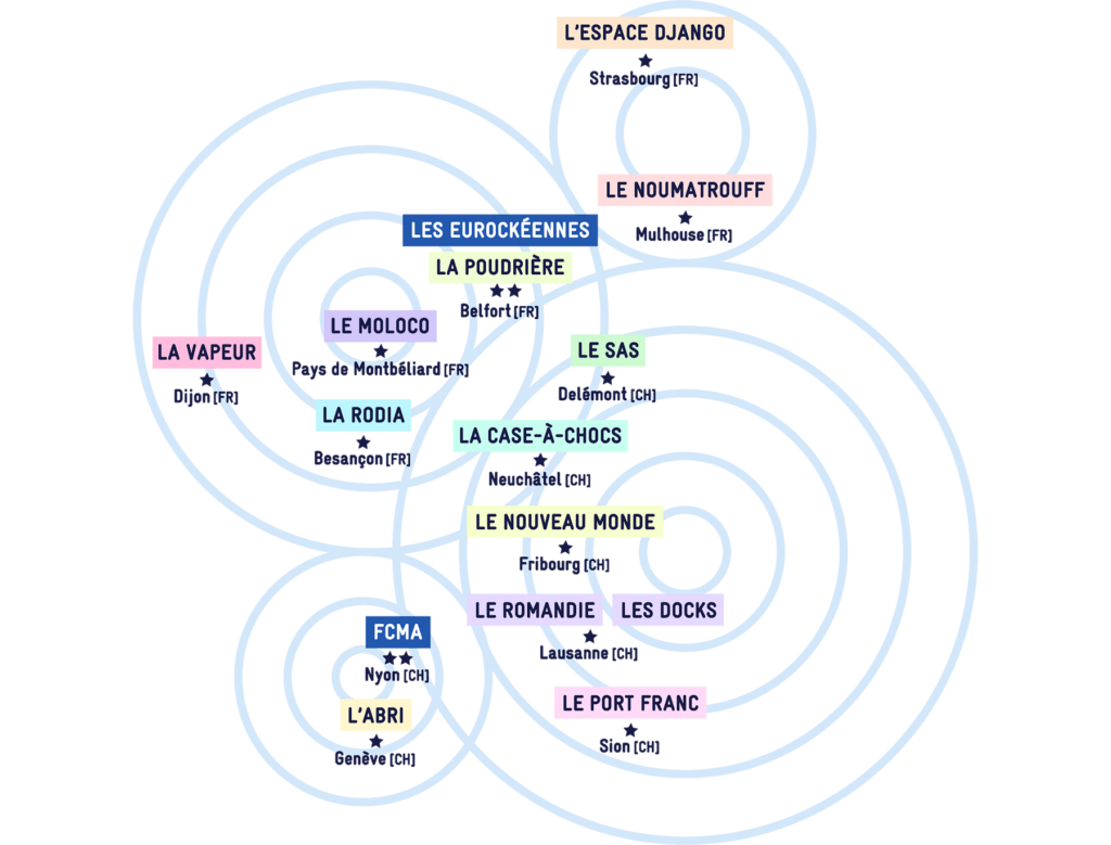 Initié et conduit par les Eurockéennes de Belfort (FR) et la Fondation CMA (CH), l’opération réunit 15 actrices et acteurs culturel-les franco-suisses et développe un projet expérimental d’accompagnement de 12 groupes émergents. Ces projets artistiques bénéficient d’une résidence de 3 jours dans une salle partenaire du pays voisin avec un coaching personnalisé, d’un temps de formation commune (ICEBERG CAMP) et de l’entourage et des conseils des entités impliquées dans le dispositif. Les programmes, les thématiques et les intervenant-es engagé-es évoluent chaque année.